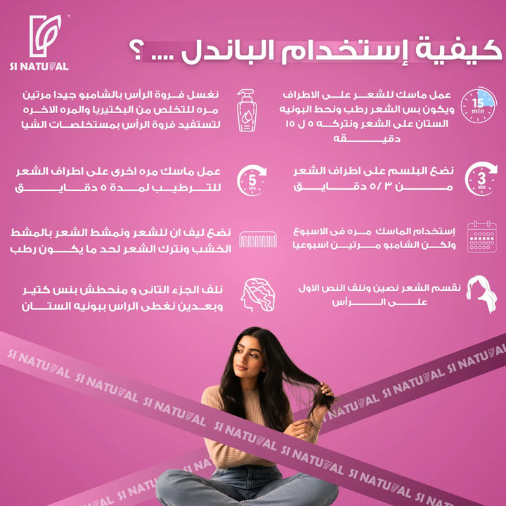 ماسك الشعر: ضعي ماسك الشعر على أطراف الشعر عندما يكون الشعر مُبللاً فقط. ارتدي البونيه واتركيه على الشعر لمدة 15 دقيقة.